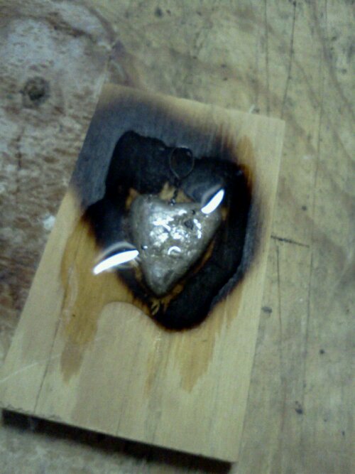 Step 6. Pour on a little water on to quench the metal. Allow to cool before handling. See how the wire is imbedded in the amulet?