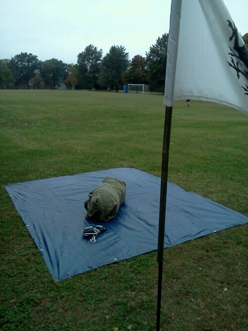The photo at left is of the setup for our ground fighting practice at The Order of Seven Hills this past Saturday. We staked out a tarp, whipped out a heavy bag, and got to work (the heavy bag in the photo is DIY — for instructions click here.)