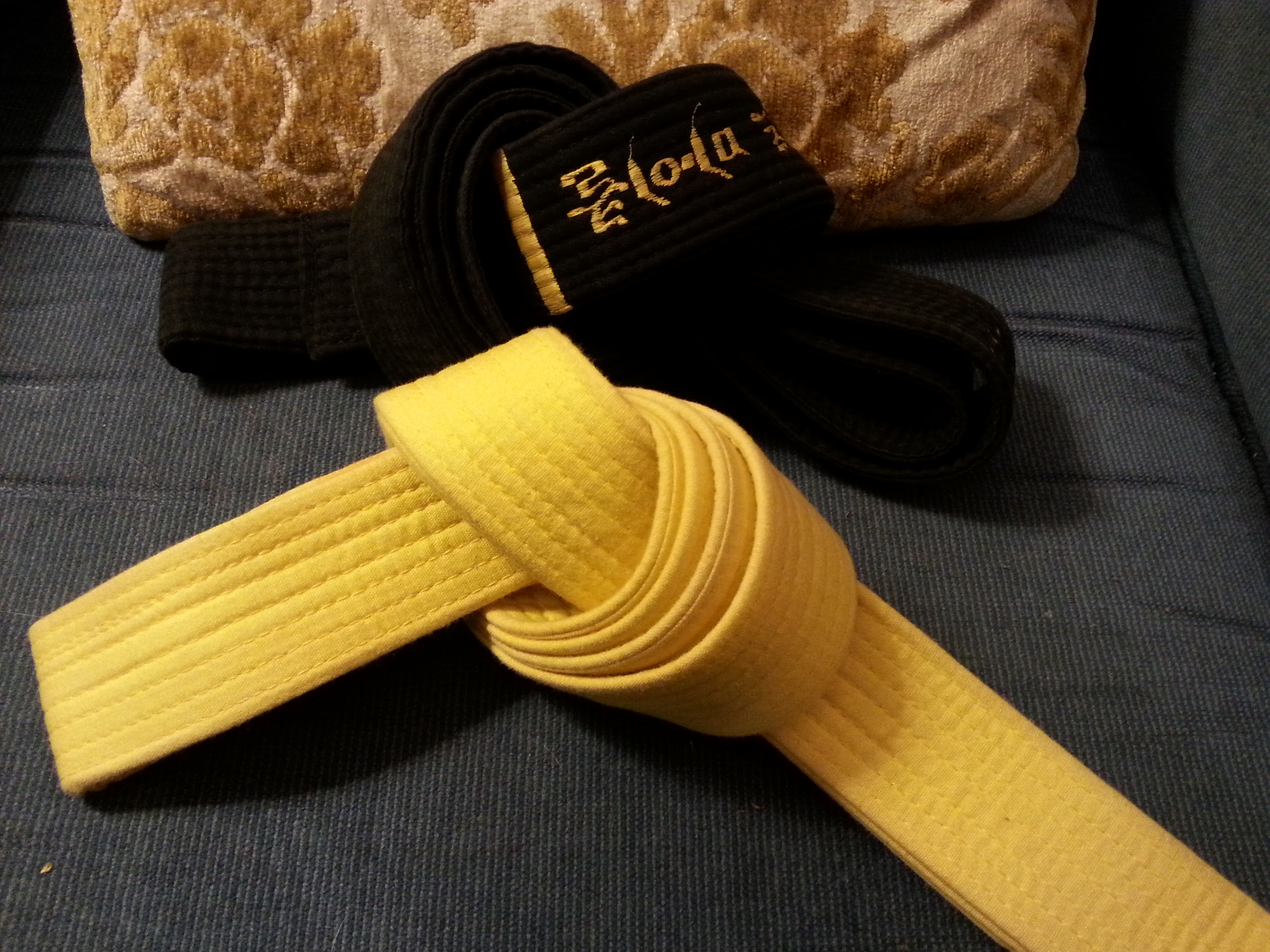 At the top is my black belt. Beneath it is my yellow belt, which is more sacred to me than the black. Ask me about it sometime and I’ll explain.