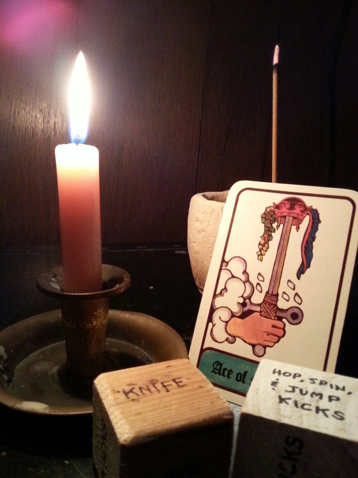 KNIFE (or primary weapon, 4 x 2:00 vs. Dbl. End Ball, alternating hands & grips); SPIN KICK COMBOS (15 mins); MEDITATION (10 mins)