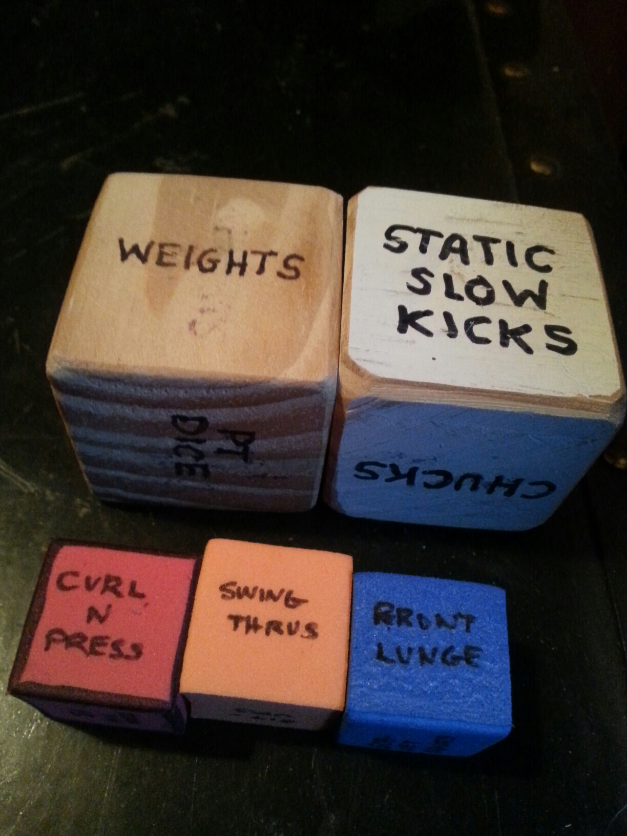 WEIGHTS (5×10, slow w/ perfect form, of Curl’n’Press, Swing-thrus, Front Lunges); SLOW KICKS (10 ea. leg, very slowly w/ perfect form, of Side, Roundhouse, Knee, Stamp, & Snap, hand on wall or sturdy object if needed)