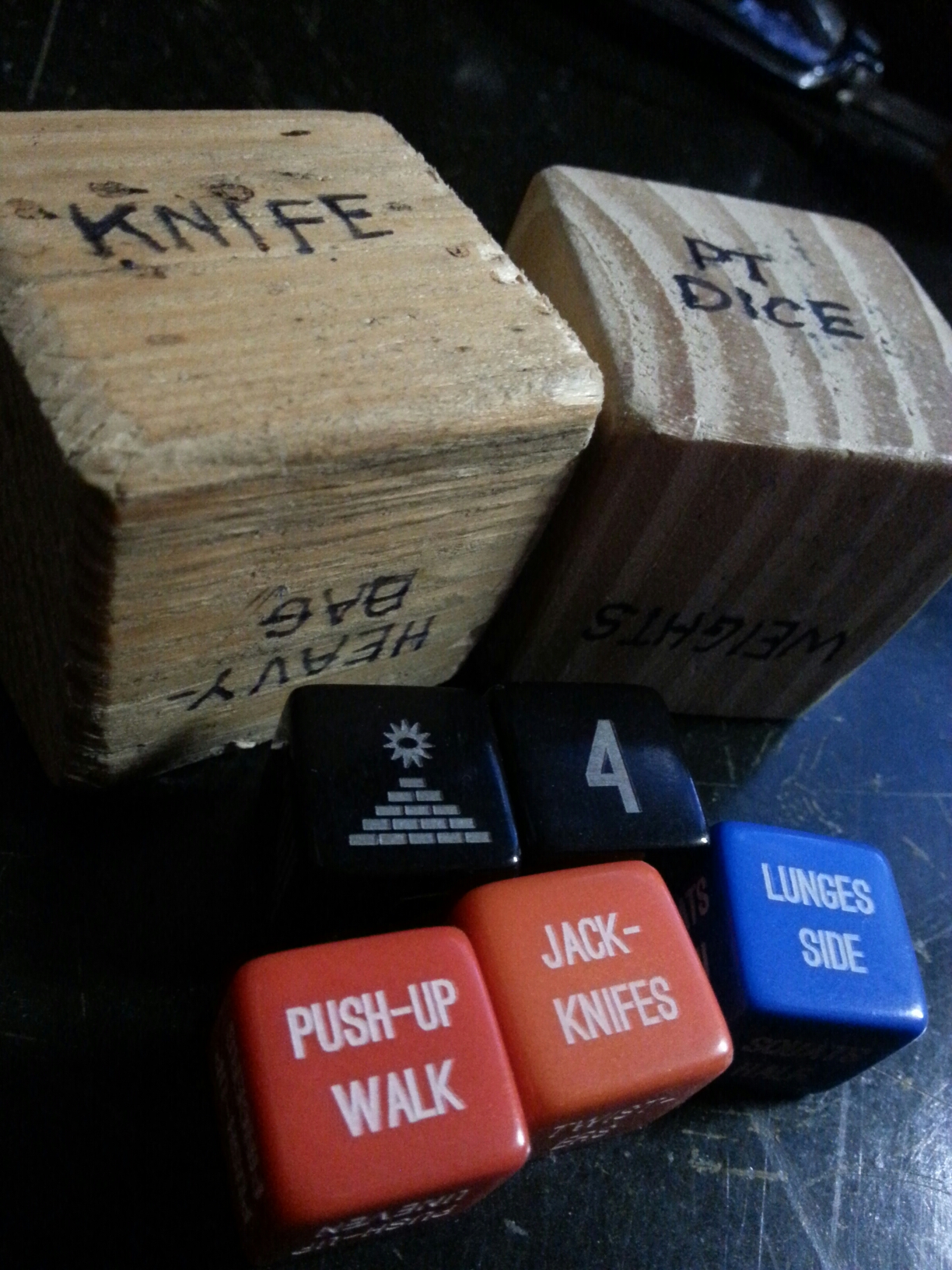 WEAPON COMMAND AND MASTERY DRILL: Choose your practice weapon (I used a wooden knife). Complete a full pyramid to 10 of Walking Push-ups (on knuckles w/ weapon hand), Jackknifes (2 hits/cuts/strikes at top of each), and Side Lunges (2 hits/cuts/strikes at bottom of each). If applicable, switch grip for 2nd half of pyramid. Count errors (number of times you drop the weapon and/or the live end of practice weapon touches your body or the floor). When pyramid is complete, do 25 Squats (2 hits/cuts/strikes at bottom of each) for every error.