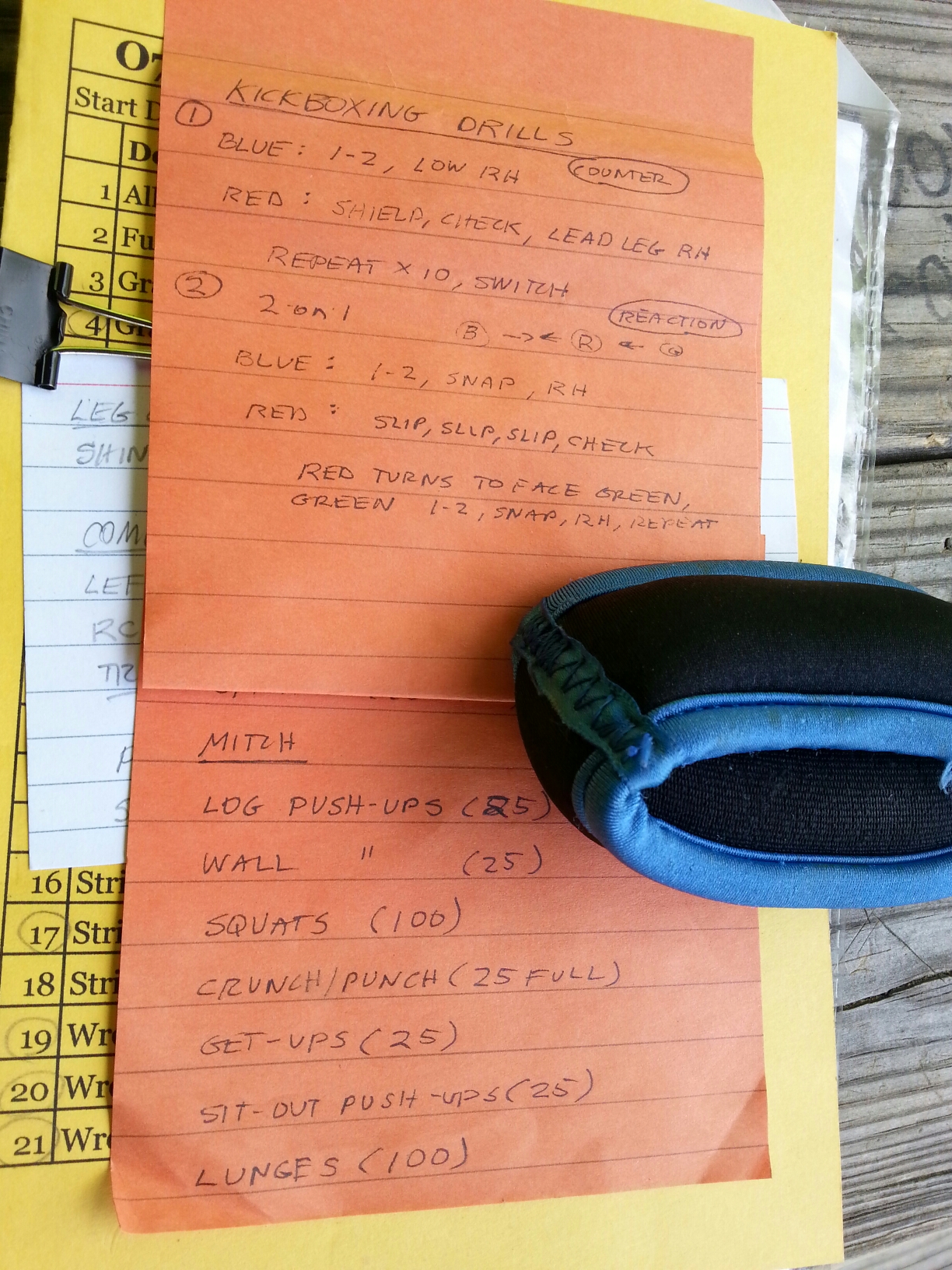 (2) CONSTITUTIONAL: 25 Log Push-ups, 50 Wall Push-ups, 100 Squats, 50 Sit-ups, 25 Get-ups, 25 Barrel Roll a.k.a. Sit-out Push-ups, 100 Side Lunges (50 each way).