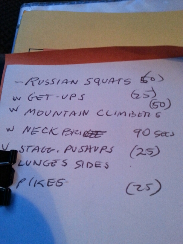 Wrestling: 8 x 2:00/1:00 of free play followed by this Constitutional: Russian Squats (50), Get-ups (25), Mountain Climbers (50), Neck Bridge (90 secs), Staggered Push-ups (25), Side Lunges (25/side), Pikes (25)