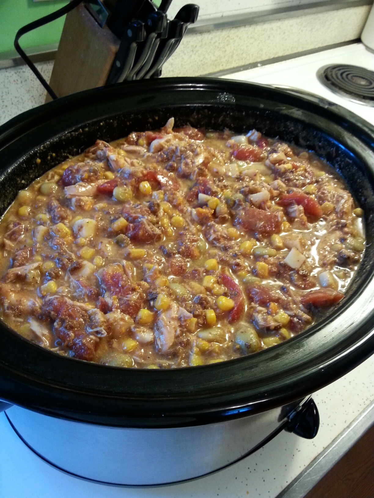 Place all ingredients in crock pot. If too thick, add chicken broth to desired consistency. Cook 8 to 10 hours. Eat, enjoy, get full, belch, repeat.