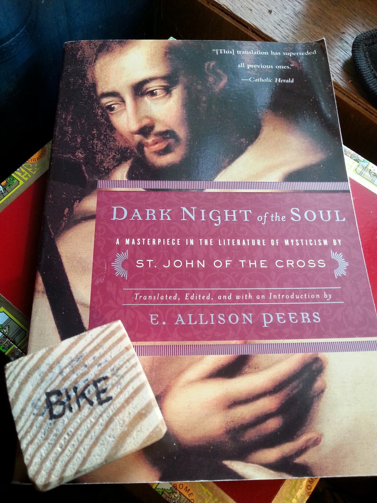 Today’s book recommendation: In the background of the photo above you’ll notice the often joked about “Dark Night of the Soul” by St. John of the Cross. Required reading for anyone pursuing the mystic path, this is a short but deeply moving and important book. Many people seem to think it’s just for those of Catholic faith. It isn’t. Read this powerful little tome and you’ll see why it’s title is now a universal phrase for the ultimate struggle preceding enlightenment.