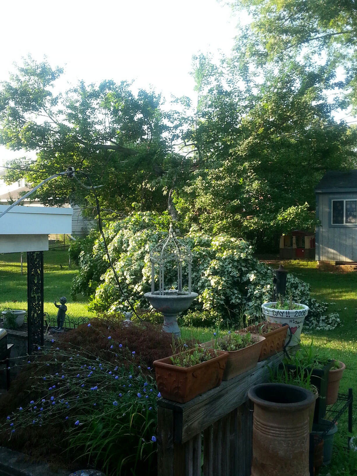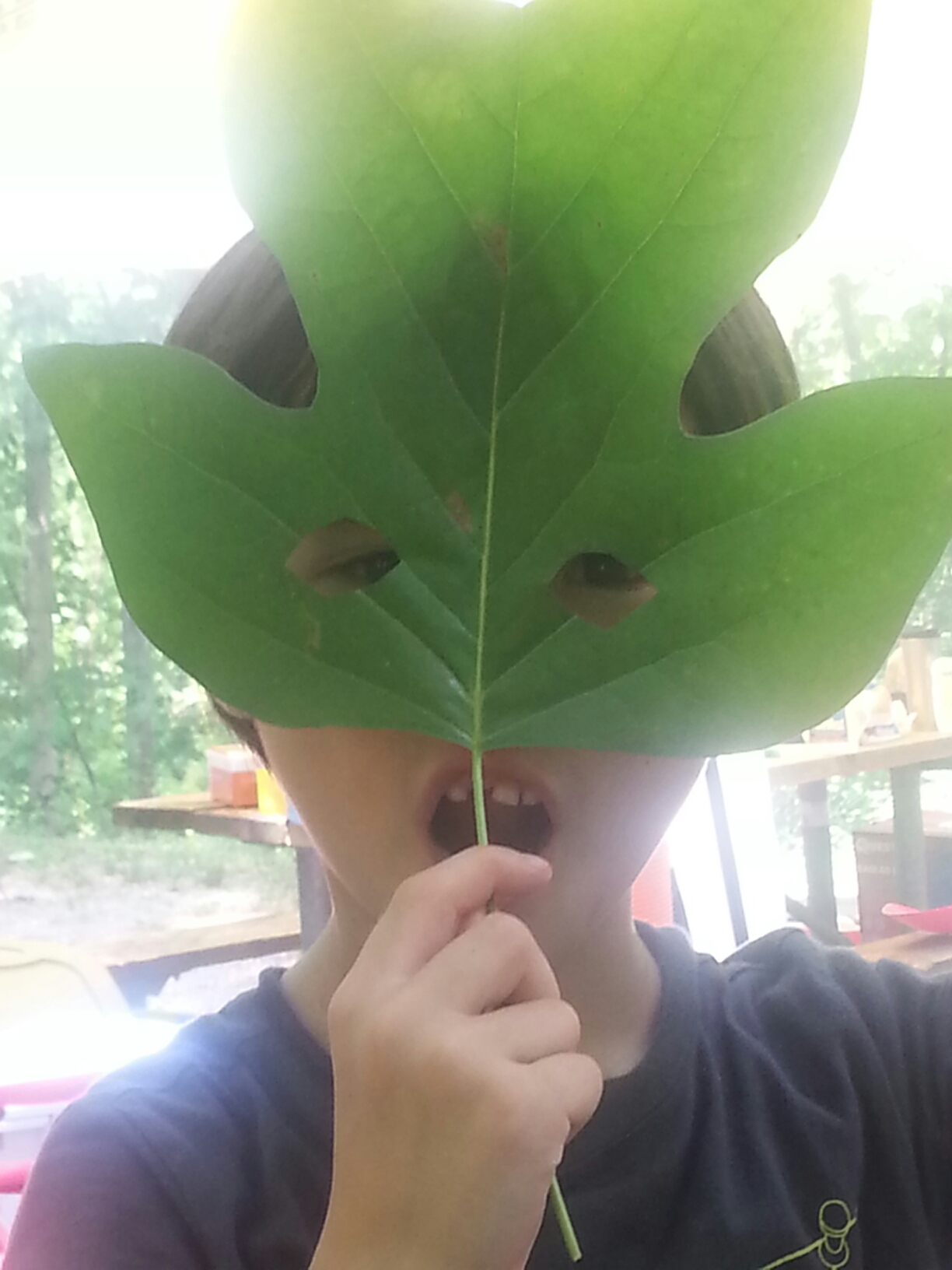 3. I went camping this past weekend. Even though it was as hot as Satan’s underpants, and even though we had to head home early on account of severe storms, we had a great time. For the grandkids I made masks out of Poplar leaves. We saw a big ‘ol rat snake. We ate delicious food items. Made it home before the storm hit, just in time to see a tree in my backyard break in half. Pictures below.