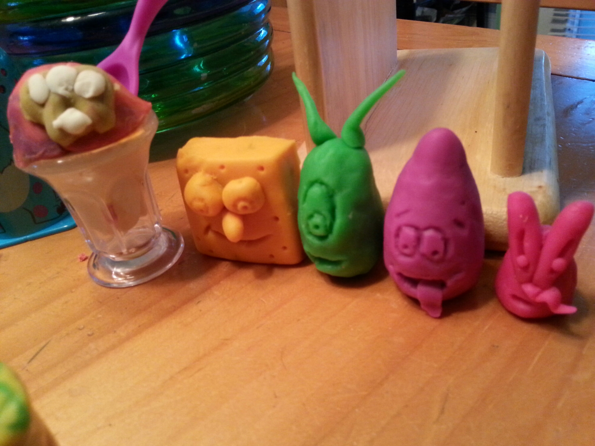 (In the pictures below, I’m the one with the glasses. My granddaughter made the amazing ice cream cup, my grandsons the pizza and milk shake, and I made the Spongebob characters.)