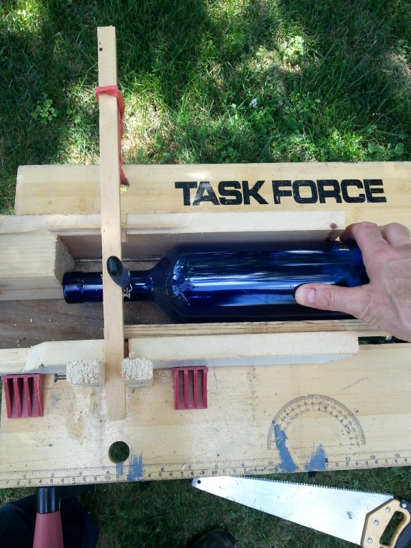 Top view. Stop block at left keeps bottle in place, right hand turns bottle, left hand (omitted) pushes down.