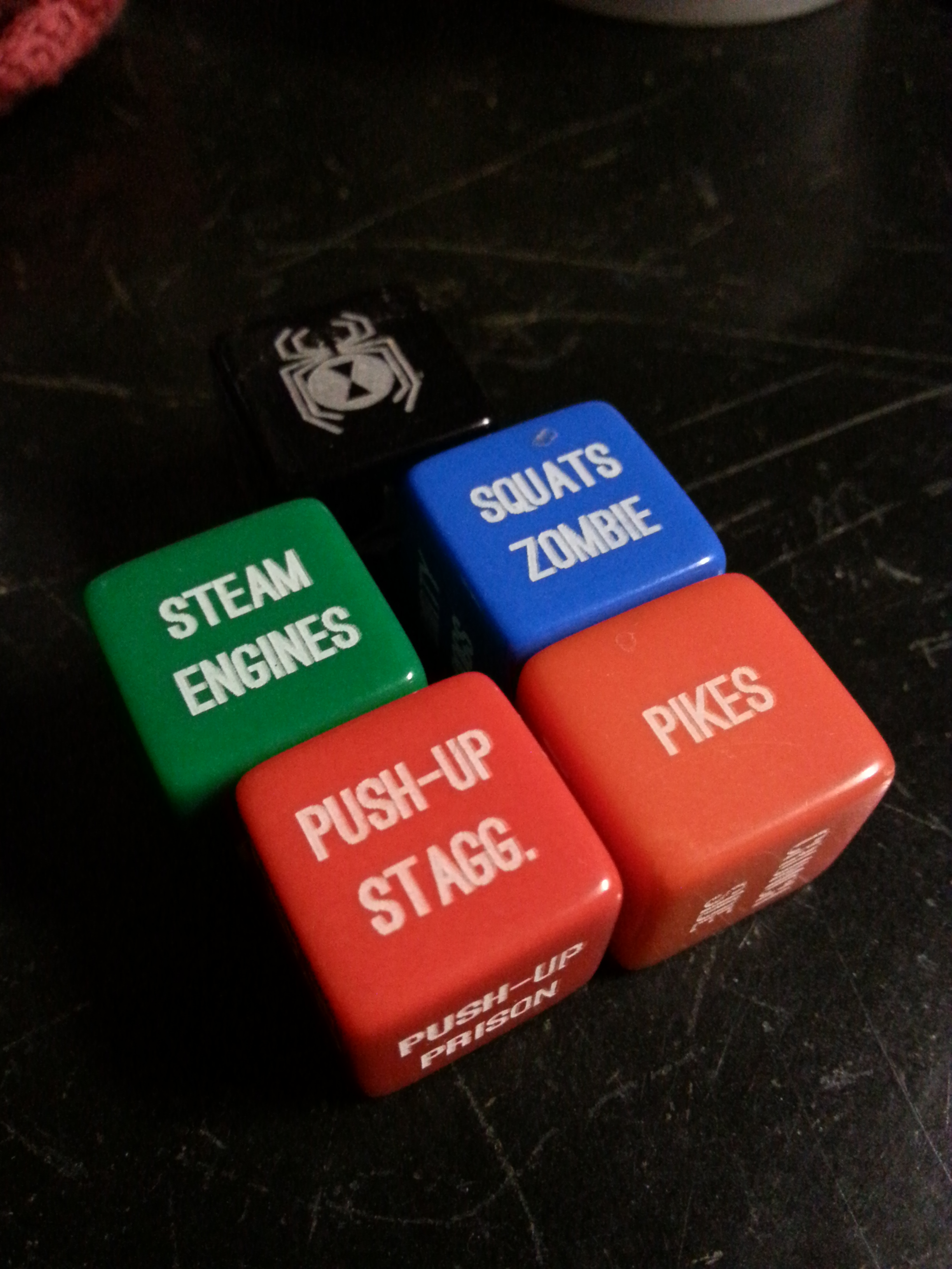 - 8-minute Blast. As many sets as you can in 8 minutes of 10 Steam Engines, 10 Zombie Squats, 10 Staggered Push-ups, and 10 Pikes — take as few 12-second breaks as you need to finish, preferably none. I made 5 full sets with zero breaks (PTDICE are great for generating workouts like this).