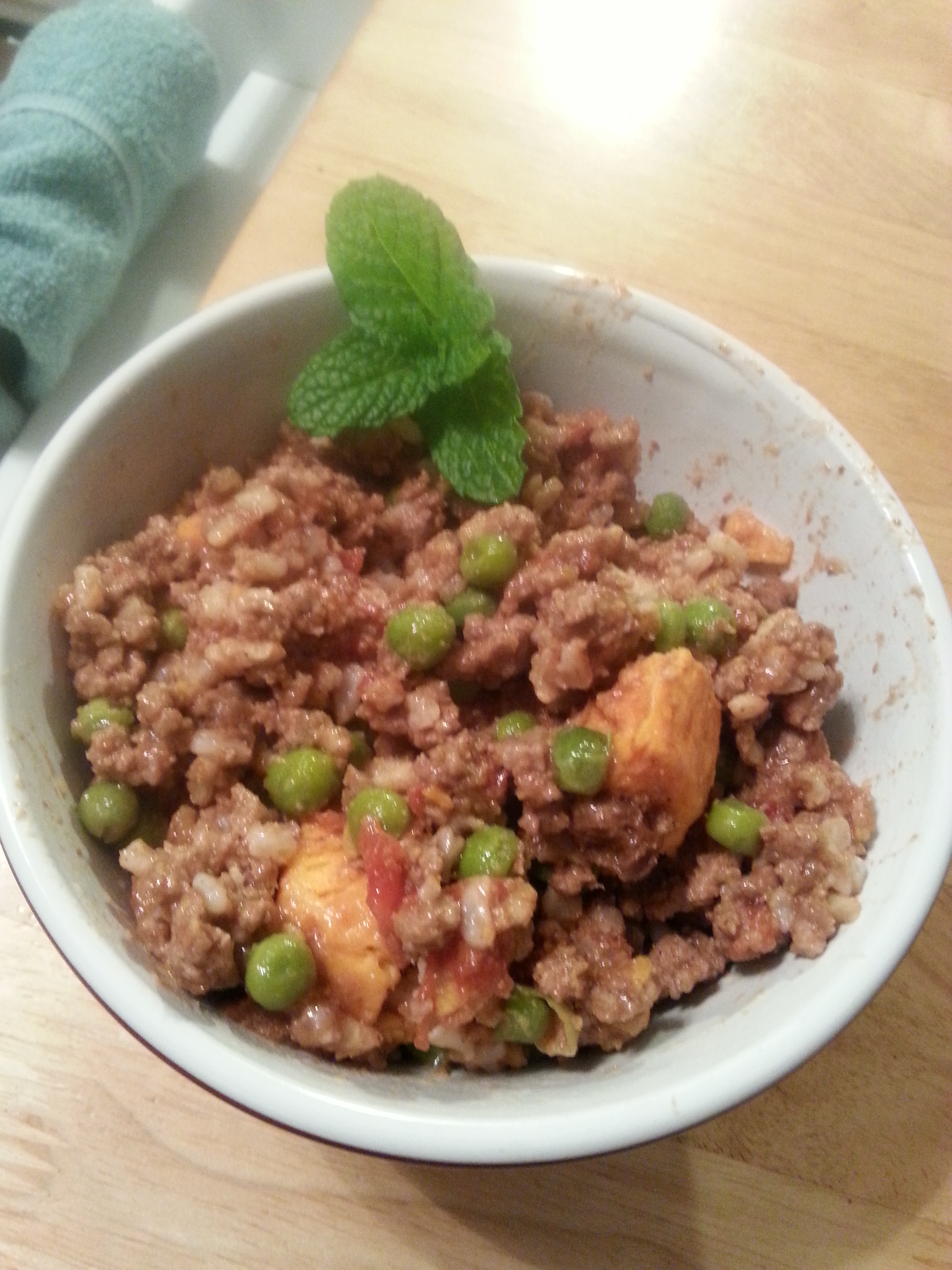 Brown beef and drain while your peeled and cubed sweet potatoes are boiling and your brown rice is cooking. When done, add all of it the pot. Throw in peas, raisins, tomatoes and spices. Put a lid on it and let it bubble on very low heat until heated through. Like most stews, it’s much better on the second day after the spices settle in and permeate the ingredients. This is two servings for me, which means it’s actually four servings.