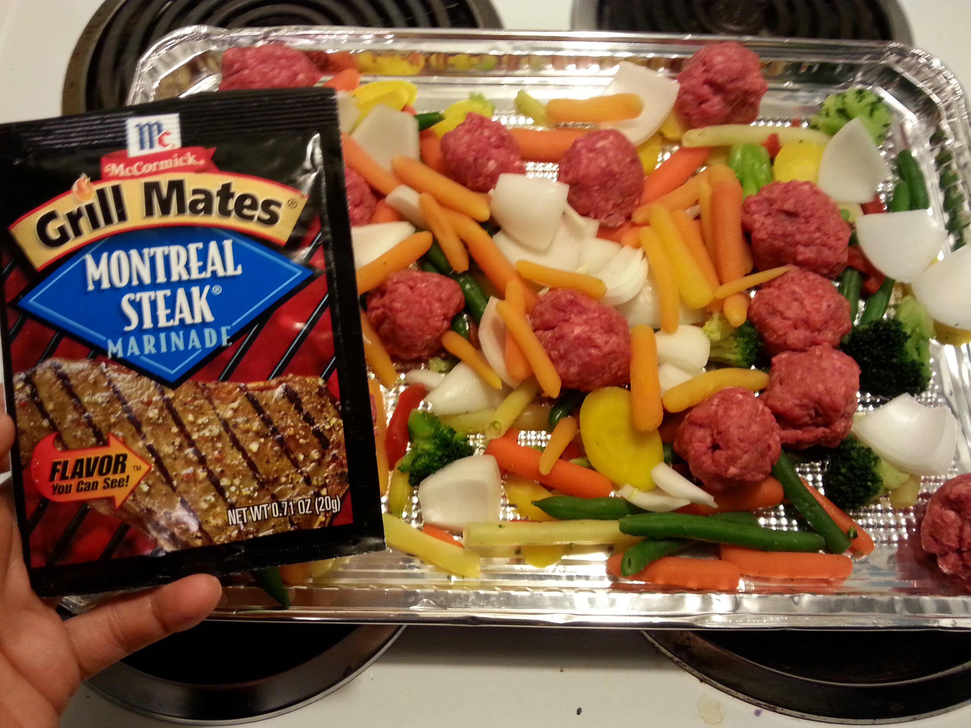 Cook frozen veggies for for 1/2 of the time listed on the bag (if you don’t they won’t be done at the same time as the meat). While they’re going, form your ‘burger in to golf ball sized meatballs and throw then into a 9″ x 13″ aluminum pan. Chop up onions and add them in. Add veggies when ready. Sprinkle on the seasoning. Put pan on grill, cook uncovered with smoker lid closed for 15 mins, stirring every 5 mins. While eating, try not moan like Meg Ryan from When Harry Met Sally.