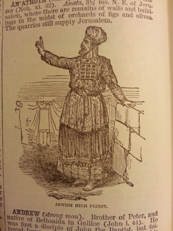 An illustration of a Jewish High Priest from Smith’s Bible Dictionary. Looks like he’s using one finger.