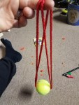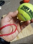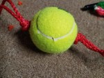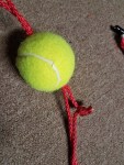 Anyway, here’s a photo gallery showing how I made the “sharpshooter” tennis ball one. Follow the captions below the photos. Once it’s done, all you have to do is anchor your ball to opposing surfaces or sturdy objects — hooks in walls, posts, pillars, or what-have-you — using bungee cords.
