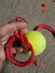 - Put the ball between your feet and pull on ONE SIDE so that the knot is hidden inside the ball.