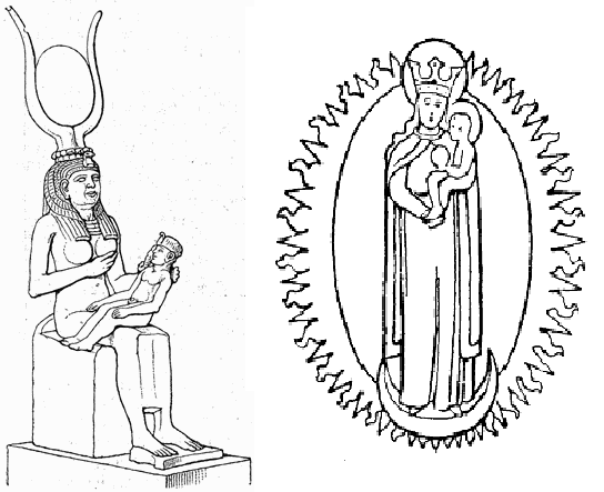 Left: Isis and baby Horus. Right: Mary and baby Jesus. Note that Mary and Jesus are inside a flaming vesica piscis. That’s not a coincidence.