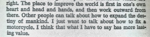 This is a quote from “Zen and the Art of Motorcycle Maintenance” by Robert Pirsig. The older I get the more sense this book makes. Haven’t read it? Do it.