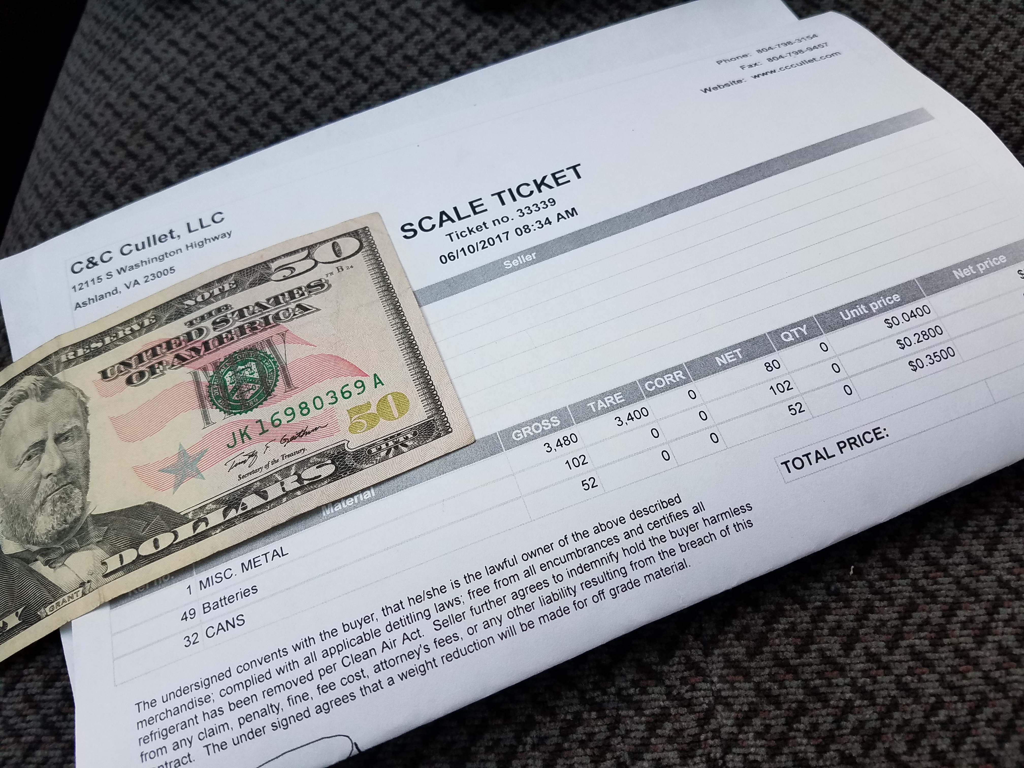 I’ve been accumulating aluminum and other recyclables to cash in to benefit the Cabal Fang Temple Fund. This past Saturday I took the first batch up to C&C Cullet on Route 1. Four bags of aluminum cans, two auto batteries and 80 pounds of scrap metal earned us $50.00 to add to the Cabal Fang Temple Fund.