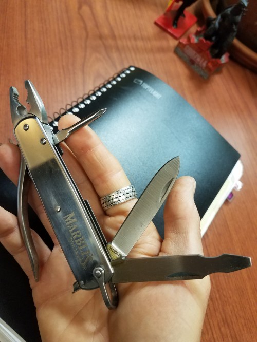 Marble’s safety pliers, unfolded this time. Pliers, Phillips head screwdriver, knife blade, file/screwdriver combo