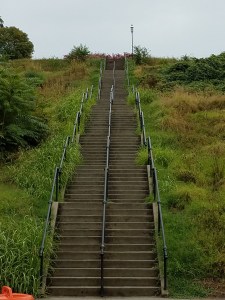 I put on my 40 lb. pack and explored the park. Then I went down and up those 153 insufferable stairs four times. They feel like standard 7.5″ steps, so each time up equates roughly to a 10 storey building — 4o storeys in all on the day. I’m guesstimating of course, but that’s roughly equivalent to climbing the stairs of the James Monroe Building.