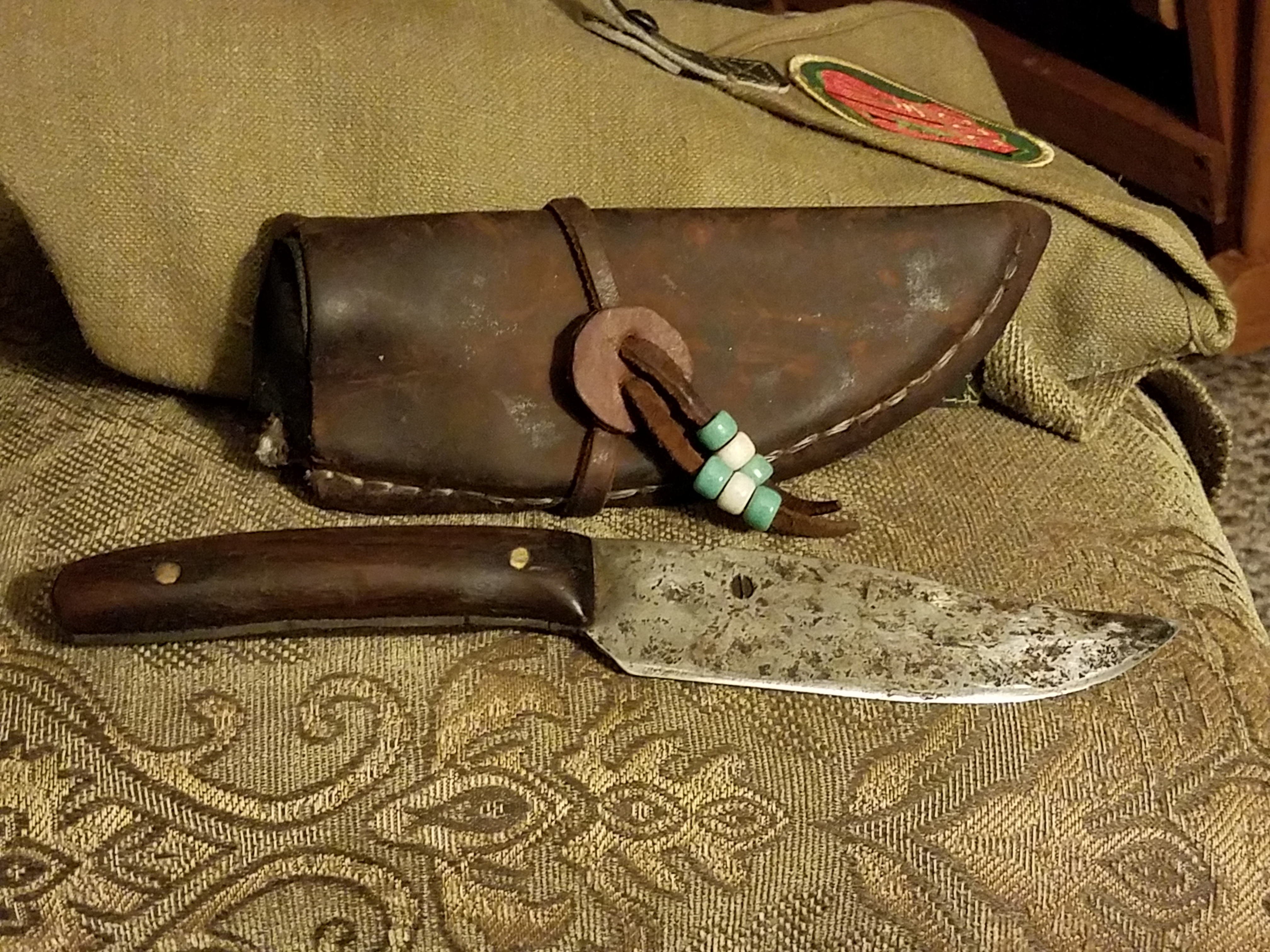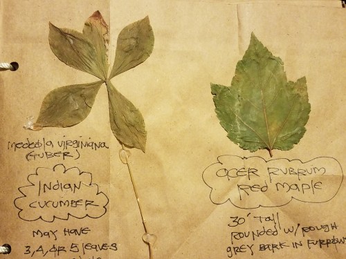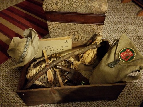 Here’s a photo set showing some of my primitive skills stuff. I made the basket, the spoons, the box, the drinking gourd with twine bag, and the plant scrap book. The hat is a Real Deal tarp hat, the knife is an original custom Deer Runner (handmade on an anvil using 18th century materials), and the bag is an Italian Army surplus map bag adorned with a CCC patch I bought at Pocahontas State Park awhile back.