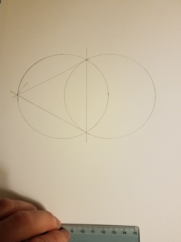 Draw two more lines connecting the points where the circles intersect to the point you just marked. Now you have an equilateral triangle within a circle.