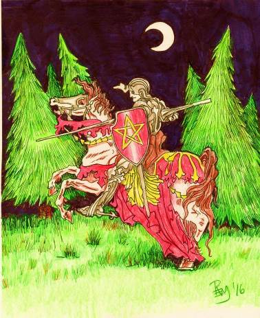 Sir Gawain with his shield bearing the pentangle or pentagram as illustrated by yours truly in “Cabal Fang: Complete Martial Arts Study Course from Querent to Elder”
