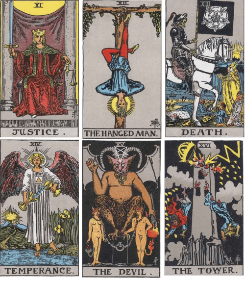 - Meditation. Lay out the spread of cards below, print out the picture, or set up your tablet/laptop. Set a timer for 5 to 10 minutes. Look at the pictures. What story does this little “chapter” of the Tarot “book” relate? Don’t think in words — look at the pictures as if they are selected photos from a children’s book. What are the intervening pictures that complete the story? What comes after?
