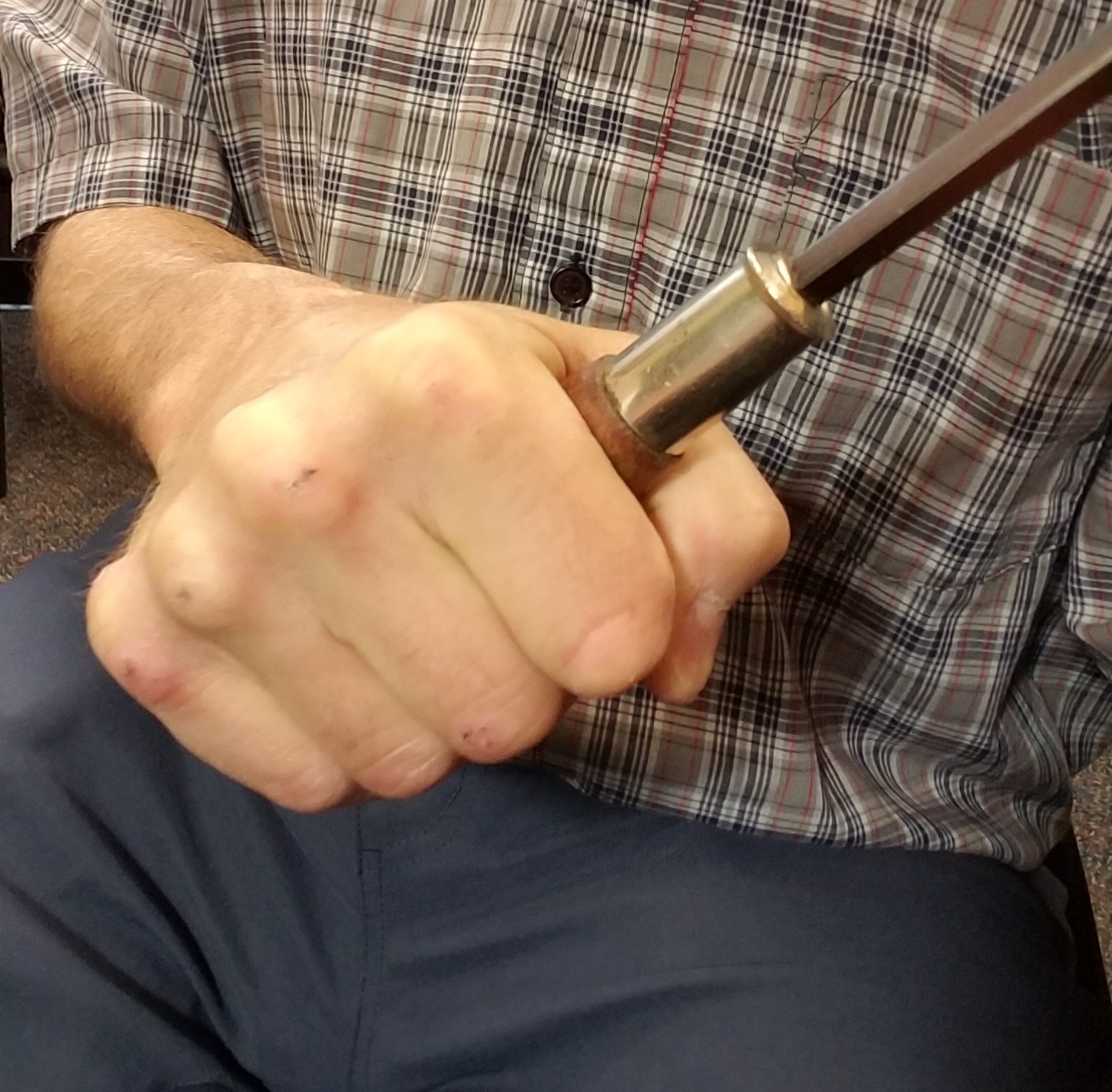 This is me holding a screwdriver. This is what a martial artist’s hand looks like when it is holding a tool in a workmanlike fashion. Note callouses and white-knuckled grip with thumb fully wrapped.