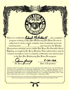 - Jun Fan Kickboxing Cert. from Dr. Jerry Beasley