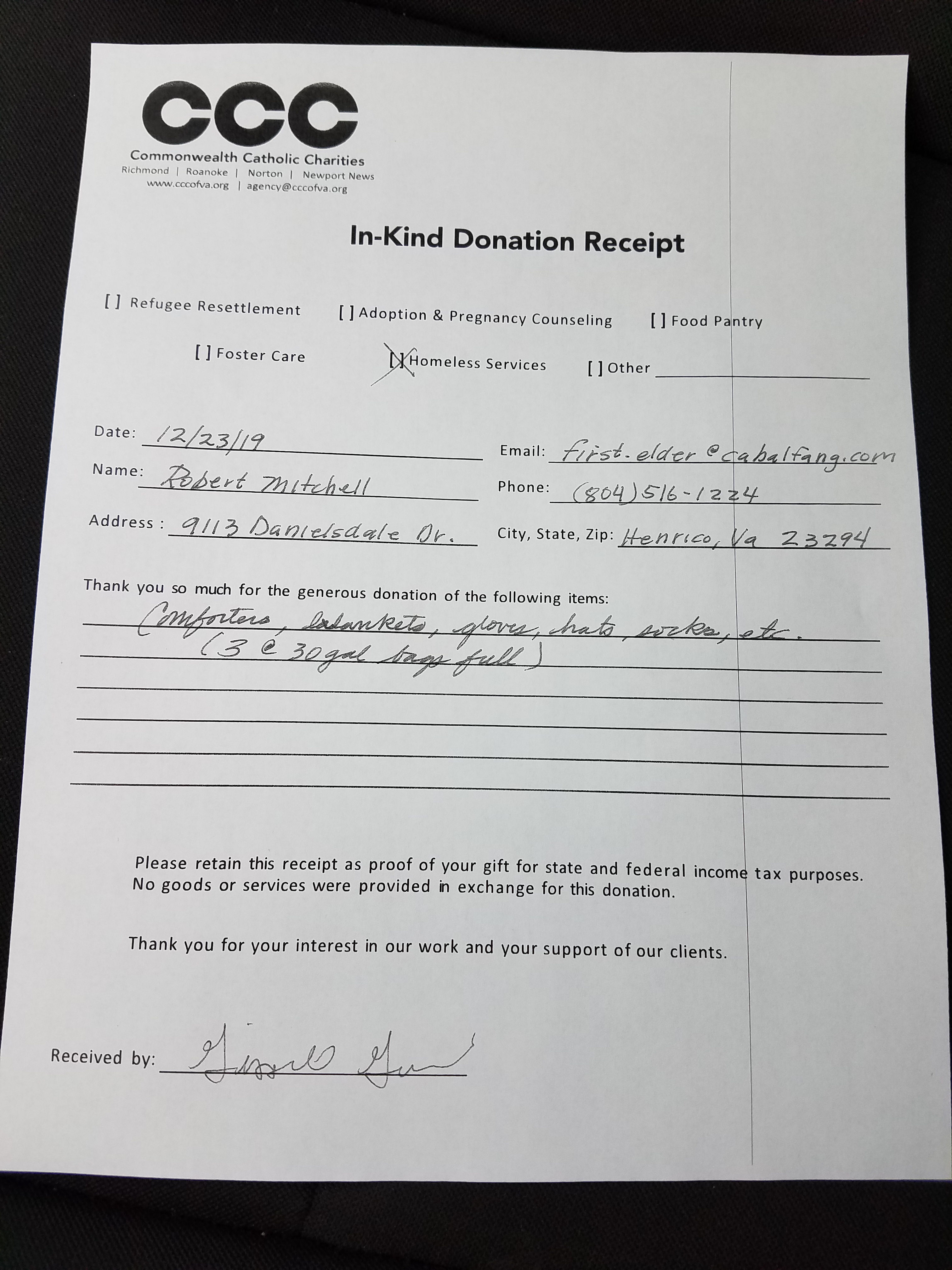 With the help of my martial arts club, my family, and my friends (and by raiding my own closets) I was able to gather 3 large bags of blankets, coats, hats, socks, gloves and mittens for the homeless which I dropped off at Commonwealth Catholic Charities (CCC) this morning. When it comes to the homeless, CCC is pretty much the only came in town.