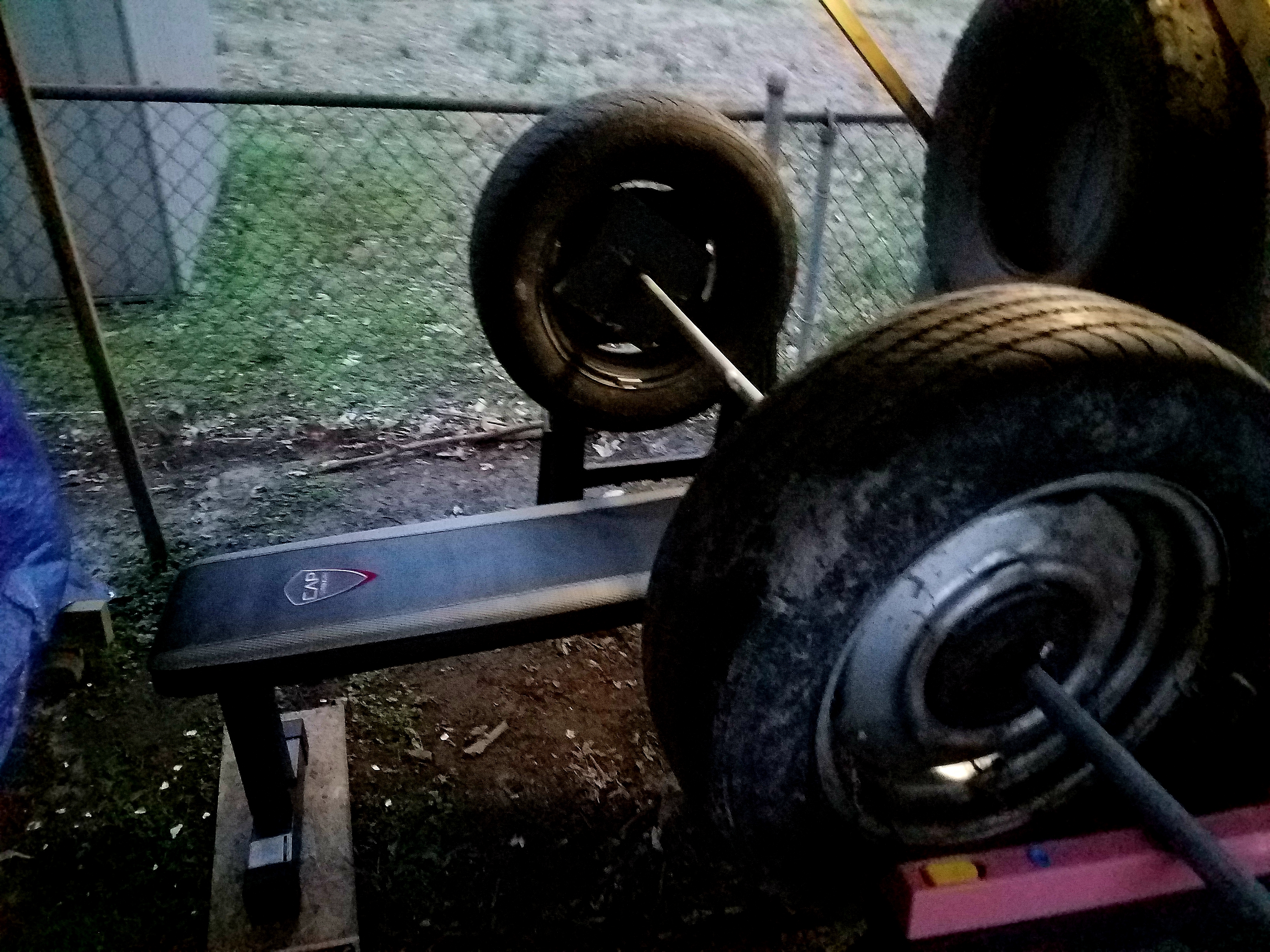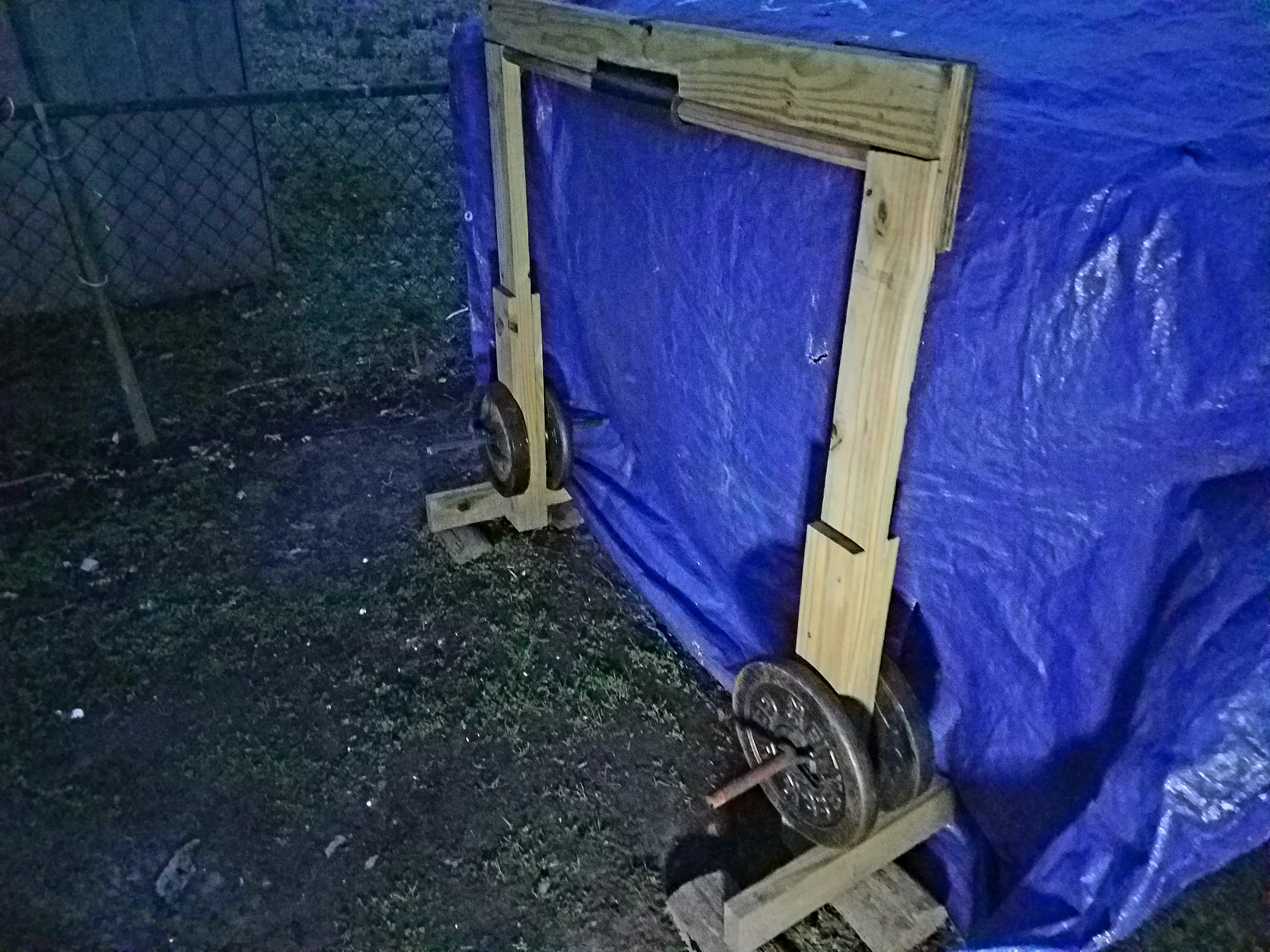 If you love your art you will do whatever it takes to make it, including fashion your own weights from auto tires, decking boards, tarps, and old metal pipes. And you will do it with joy and a sense of pride. This whole set-up cost me just a little over $100.00.