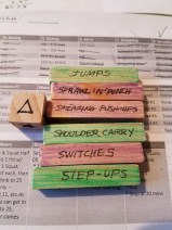 - 20 minute pyramid of 6 martial fitness exercises. Jump, Sprawl ‘n’ Punch, Smearing Push-ups, Shoulder Carry, Switches, and Step-ups. This will really build the kind of strength you need for grappling and self-defense. Get yourself a heavy bag you can manage (I used a #45) and set a timer for 10 minutes. Start with 1 rep of each exercise, then 2, 3, 4 etc. Climb until the timer beeps. Finish the set you’re on and then descend. If you don’t slack off, you should finish up just before the timer beeps. See video below for details. A full pyramid up to 6 is a nice target number for this drill.