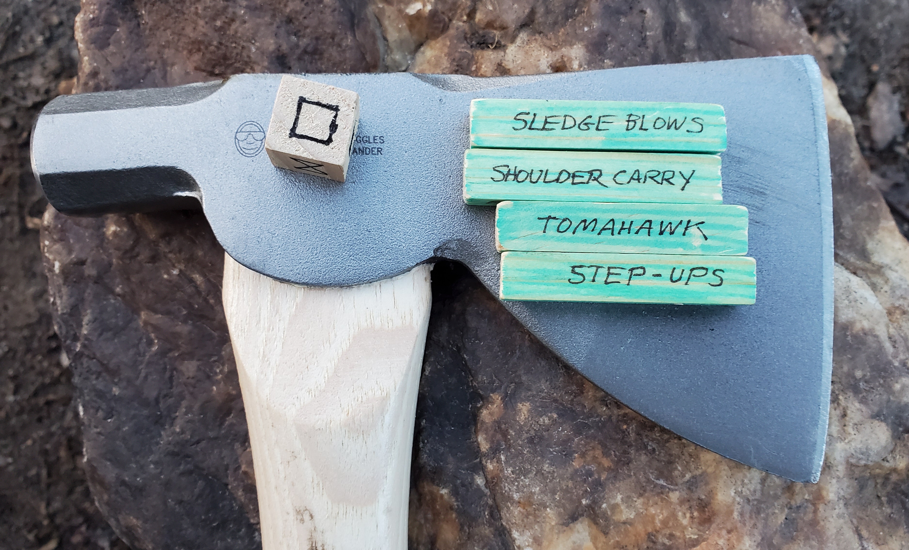 • Do some purposeful fitness. What are you getting fit to do?  How about real stuff in the real world.  Set a timer for desired training length based on your fitness level and needs — I did 10 minutes for maintenance — and adjust weight of sledge and sandbags as well.  Start timer.  Do 10 Sledge Blows, 50 yard shoulder carry (I did #40 each shoulder), 25 weapon strikes per hand (I did live tomahawk strikes vs. a wooden pell), and 10 Step-ups (I used a 25″ box).  Repeat until timer beeps.   Created using Frontier Rough ‘n’ Tumble dice available at Mitch’s General Store. Use coupon code “SCUFF21” at checkout and get free shipping (offer good until 1/31/21).