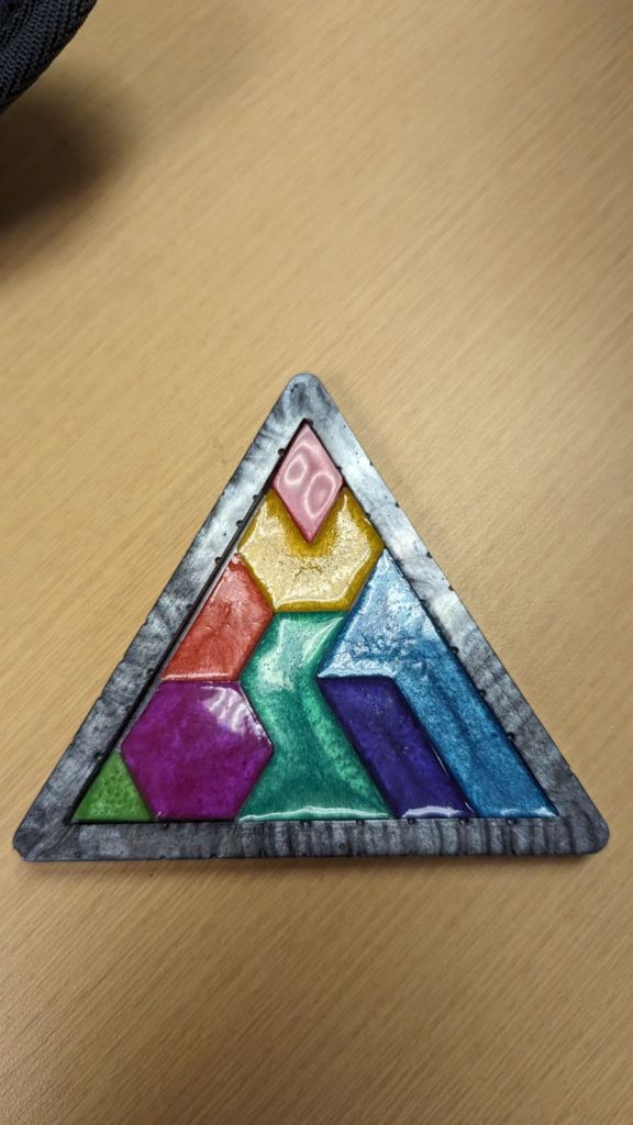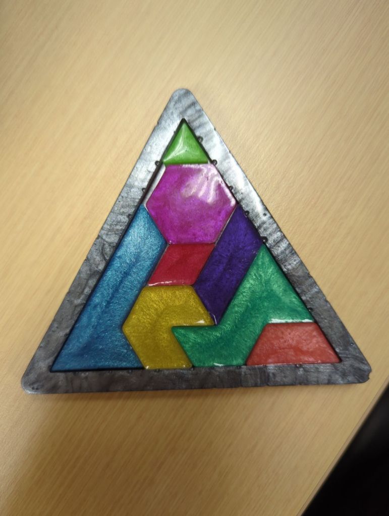 Another thing fun about this puzzle is that each piece contains a different number of equilateral triangles, 1 through 8. The smallest piece contains 1, the largest 8.