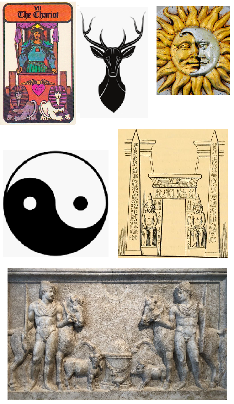 Clockwise from the upper left: The Chariot Tarot card depicts a chariot drawn by two sphinxes, one light and the other dark. The rider is being drawn along by the flow. The stag, a crepuscular animal active only at dawn and dusk, is awash in the conversation between light and dark. The Luminaries are the two heavenly bodies, one to light the day and the other to light the night. Boaz and Jachin are the pillars of Solomon’s Temple, Boaz often depicted as black and Jachin as white, evoking ideas similar to the divine twins astride horses — one dark the other light — and to the taijitu or “yin-yang” symbol — the unity of opposing forces.