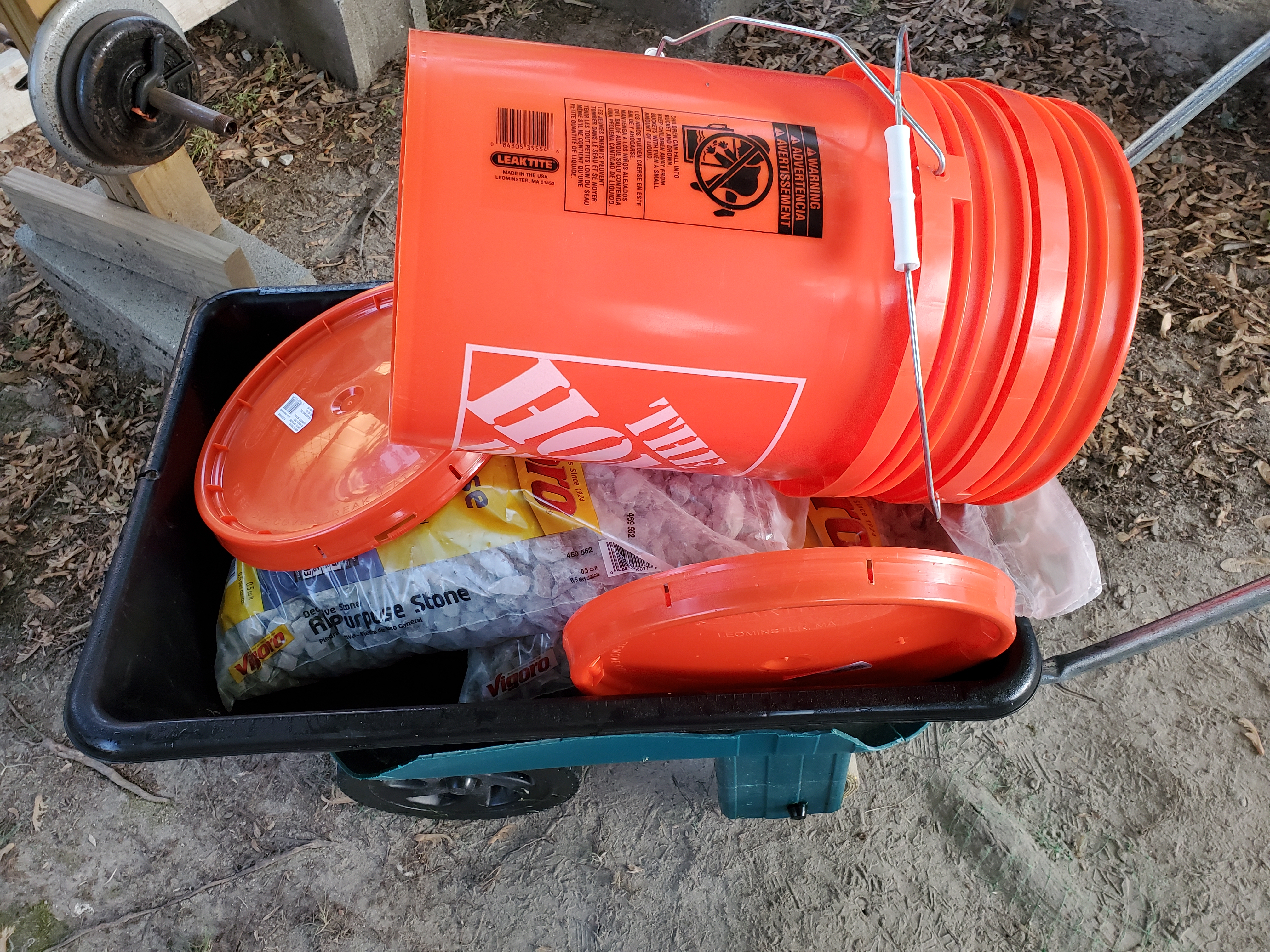 $50 bucks worth of stuff from Home Depot: 4 buckets with lids and 6 bags of gravel
